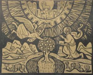 The seventh panel portrays the final part of John’s revelation – a victorious image of the eternal city, the New Jerusalem, and its associated images of the Tree of Life and River of Life (chapter 21). Christ the Lamb of God is the light at its centre.