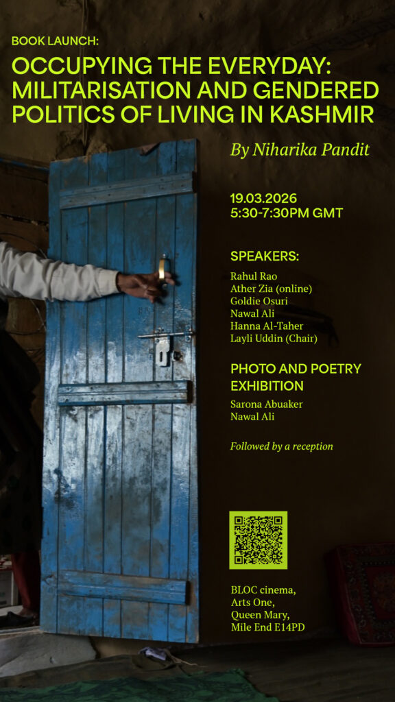 The event will feature a short presentation followed by discussion with Rahul Rao (St. Andrews), Ather Zia (online, University of Northern Colorado), Goldie Osuri (Warwick), Nawal Ali (Durham) and Hanna Al-Taher (Kassel University/QMUL). The discussion will be chaired by Layli Uddin (QMUL).